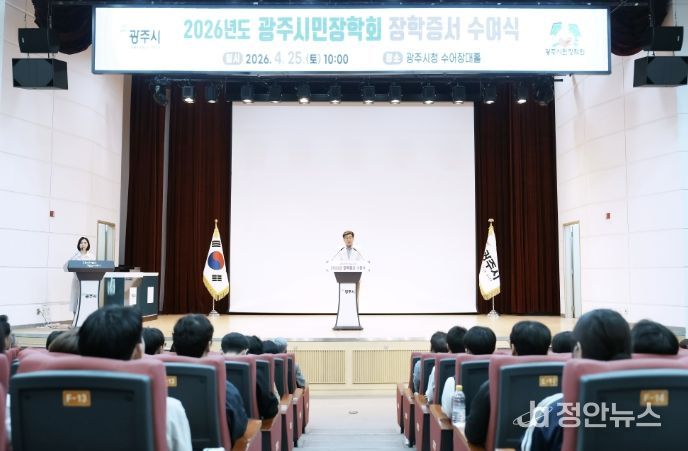 정안뉴스 안정주 기자 | 광주시는 지난 25일 광주시청 수어장대홀에서 (재)광주시민장학회 2026년도 장학 증서 수여식을 개최했다.