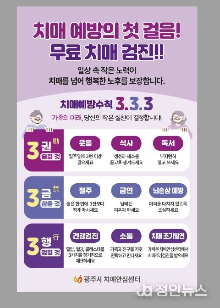 정안뉴스 안정주 기자 | 광주시치매안심센터는 치매 발병 위험이 높은 고령층을 집중 관리하기 위해 오는 29일부터 30일까지 광주시 스포츠헬스센터에서 ‘치매 조기 검진 및 인식 개선 캠페인’을 실시한다고 27일 밝혔다.