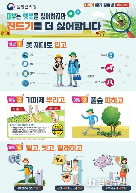정안뉴스 안정주 기자 | 의정부시 보건소는 따뜻한 날씨로 농작업, 등산, 캠핑 등 야외활동이 본격화됨에 따라 진드기 매개 감염병 예방수칙 준수를 시민들에게 당부했다.