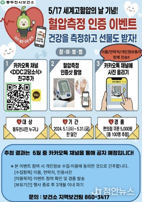 정안뉴스 안정주 기자 | 동두천시보건소는 오는 5월 17일 세계고혈압의 날을 기념해 시민들의 심뇌혈관질환 예방과 건강관리 실천을 유도하고자 ‘혈압측정 인증 이벤트’를 운영한다고 밝혔다.