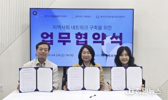 정안뉴스 안정주 기자 | 동두천시글로벌인재교육센터는 지난 24일 동두천시가족센터, 동두천시다함께돌봄센터1호점(경기도아동돌봄동두천센터)과 함께 지역사회 네트워크 구축을 위한 3자 간 업무협약(MOU)을 체결했다고 밝혔다.
