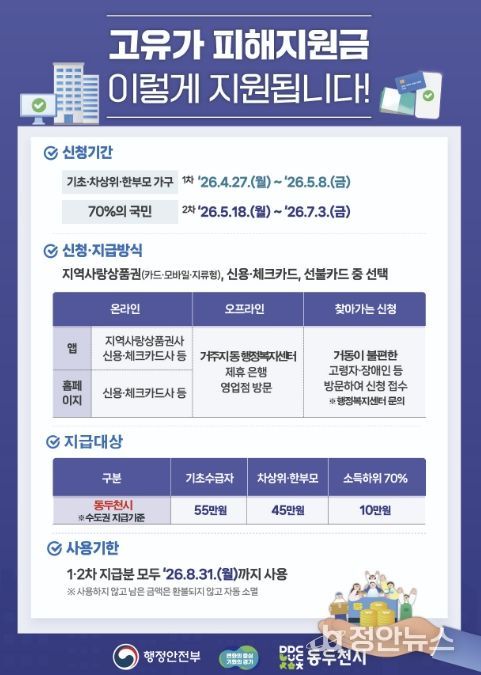 정안뉴스 안정주 기자 | 동두천시가 중동발 고유가와 고물가로 인한 시민 부담을 완화하고 지역경제 회복을 지원하기 위해 ‘고유가 피해지원금’을 지급한다.