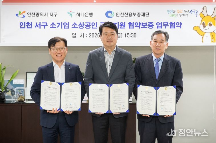 정안뉴스 안정주 기자 | 인천 서구는 지난 24일 하나은행, 인천신용보증재단과 함께 15억원 규모의 '서구·하나은행 특별지원 협약보증' 및 '인천서구 특례보증업무협약'을 체결했다고 밝혔다.