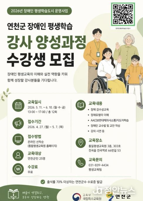 정안뉴스 안정주 기자 | 연천군은 교육부 국립특수교육원이 주관하는 '2026년 장애인 평생학습도시 운영 지원사업' 공모에 선정됨에 따라 장애인 평생교육 현장형 강사 양성 과정을 운영한다.