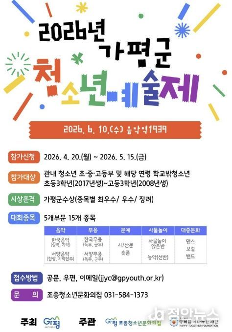 가평군 관계자는 “이번 ‘2026년 가평군청소년예술제’가 청소년들이 자신의 꿈과 재능을 발견하고 성장하는 소중한 기회가 되길 바란다”며 “지역 청소년들이 적극적으로 참여해 예술적 끼와 재능을 마음껏 펼치길 기대한다”고 말했다.