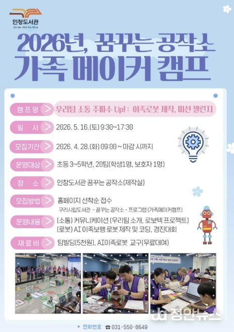 정안뉴스 안정주 기자 | 구리시 인창도서관‘꿈꾸는 공작소’는 오는 5월 16일 초등학생 자녀와 보호자가 함께 참여해 가족 간 유대감을 높이고 인공지능을 체험하는 '우리 팀 소통 주파수 Up! : 이족로봇 제작, 미션 챌린지' 가족 메이커 캠프를 운영한다고 밝혔다.