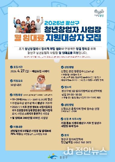 정안뉴스 안정주 기자 | 광주 광산구가 창업한 청년의 경제적 부담을 덜고, 안정적 정착을 돕는 ‘2026년 광산구 청년 창업자 사업장 월 임대료 지원사업’을 추진한다.