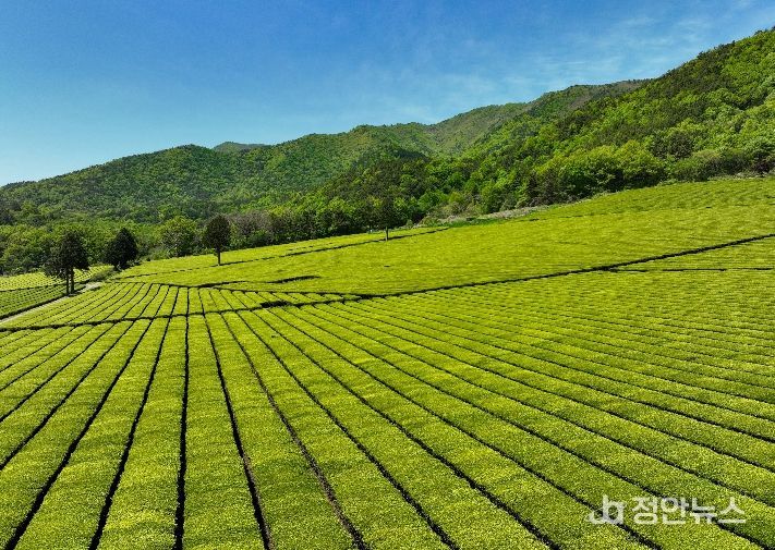 드넓게 펼쳐진 연두색 차밭이 짙푸른 산세와 조화를 이루며 마치 한 폭의 수채화를 그려낸 듯한 장관을 연출하고 있다.