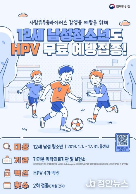 정안뉴스 안정주 기자 | 안성시는 사람유두종바이러스(HPV) 감염 질환을 예방하고 접종 형평성을 높이기 위해, 오는 5월 6일부터 HPV 국가예방접종 지원 대상을 12세(2014년생) 남성 청소년까지 확대한다고 밝혔다.