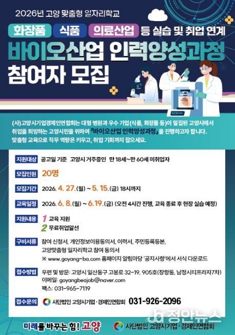 정안뉴스 안정주 기자 | 고양특례시는 2026년 고양맞춤형 일자리학교 공모사업 중 ‘바이오산업 인력 양성과정’의 참여자를 모집한다.