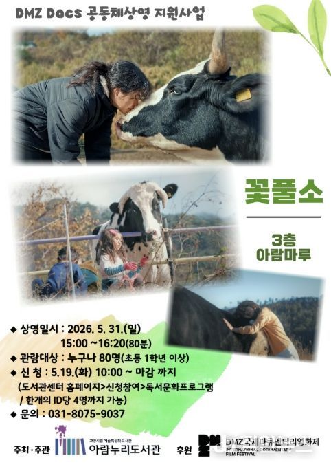 정안뉴스 안정주 기자 | 고양특례시 아람누리도서관은 DMZ국제다큐멘터리영화제와 협업해 오는 5월 31일 오후 3시, 도서관 3층 아람마루에서 다큐멘터리 영화 ‘꽃풀소’ 상영회를 개최한다.