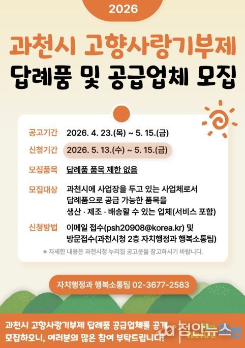 정안뉴스 안정주 기자 | 과천시는 고향사랑기부제 활성화를 위해 답례품 공급업체를 공개 모집한다고 밝혔다.
