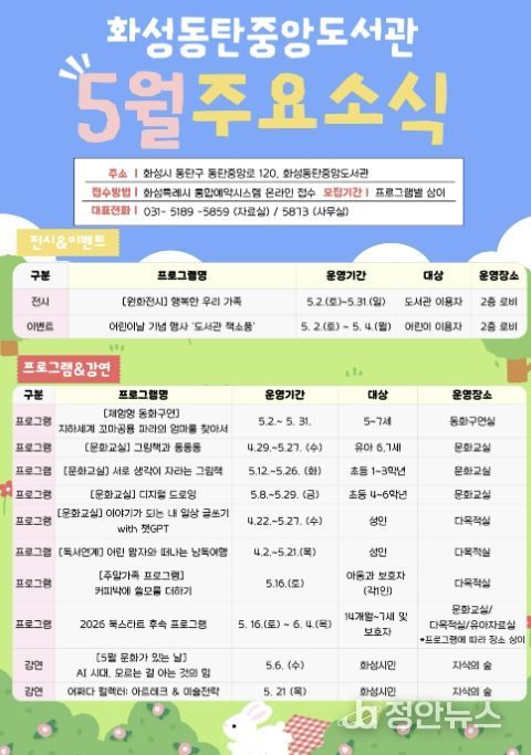 정안뉴스 안정주 기자 | 화성동탄중앙도서관이 어린이날과 가정의 달을 맞아 5월 한 달간 도서관 이용자와 시민을 대상으로 자료실과 3층 공공의 마당 등에서 다양한 문화행사를 운영한다.