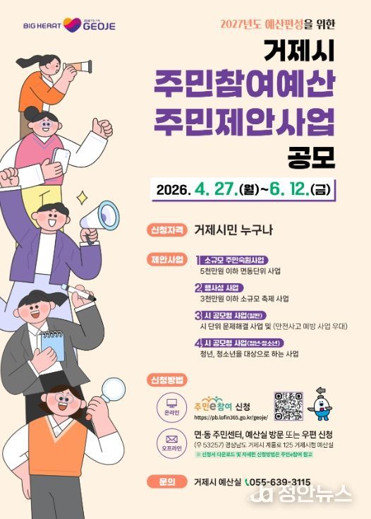 정안뉴스 김재홍 기자 | 거제시는 2027년도 본예산 편성을 앞두고 재정운용의 투명성과 시민에게 공감받는 예산편성을 실현하고자 오는 6월 12일까지‘주민참여예산 제안사업 공모’를 실시한다.