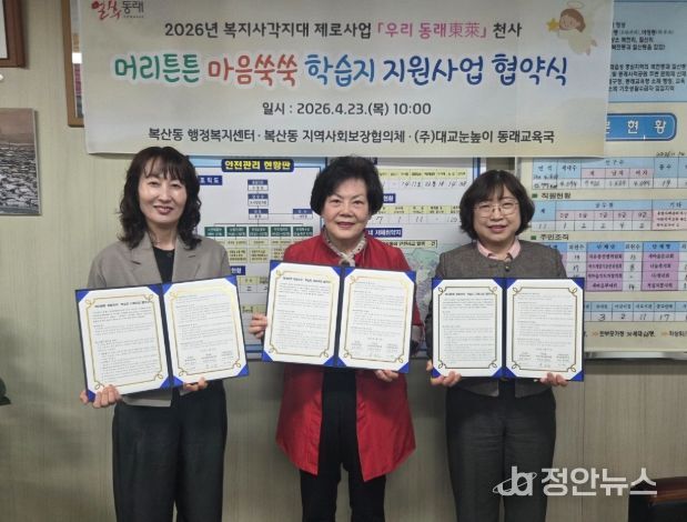정안뉴스 안정주 기자 | 부산 동래구 복산동 행정복지센터는 지난 23일 복산동지역사회보장협의체, (주)대교눈높이 부산동래교육국과 ‘머리튼튼 마음쑥쑥' 학습지 지원사업 추진을 위한 협약을 체결했다고 밝혔다.