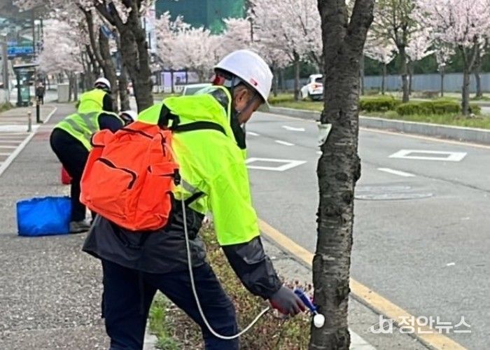 정안뉴스 안정주 기자 | 화성특례시 만세구는 최근 증가하는 식엽성 해충 피해에 대응하기 위해 주요 벚나무길을 중심으로 수간주사 방제를 실시했다고 27일 밝혔다.