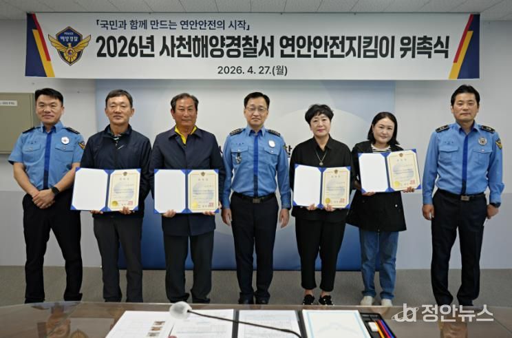 정안뉴스 김재홍 기자 | 사천해양경찰서는 27일 연안사고 예방을 위해 선발된 ‘26년도 연안안전지킴이” 4명을 위촉했다고 밝혔다.