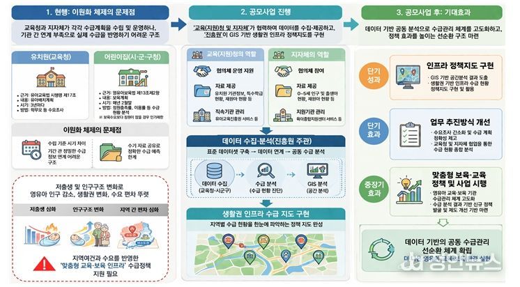 특히, 저출산으로 인한 지역 소멸 위기 확대에 따라 교육·보육 기반 시설(인프라)의 지역 간 격차는 심해지고 있으나, 유치원과 어린이집에 대해 교육청과 지자체가 각각 관리하고 있어 관련 정보의 연계 및 실질적 수요 반영이 미흡한 상황이다.