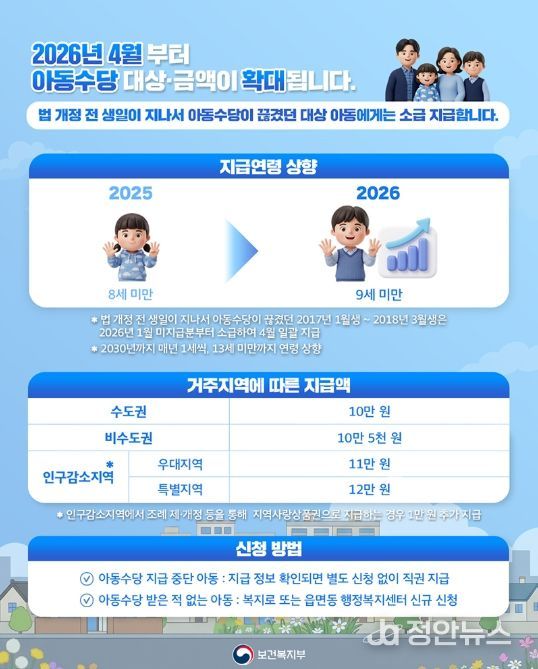 정안뉴스 안정주 기자 | 2026년 4월부터 아동수당 대상·금액이 확대됩니다.