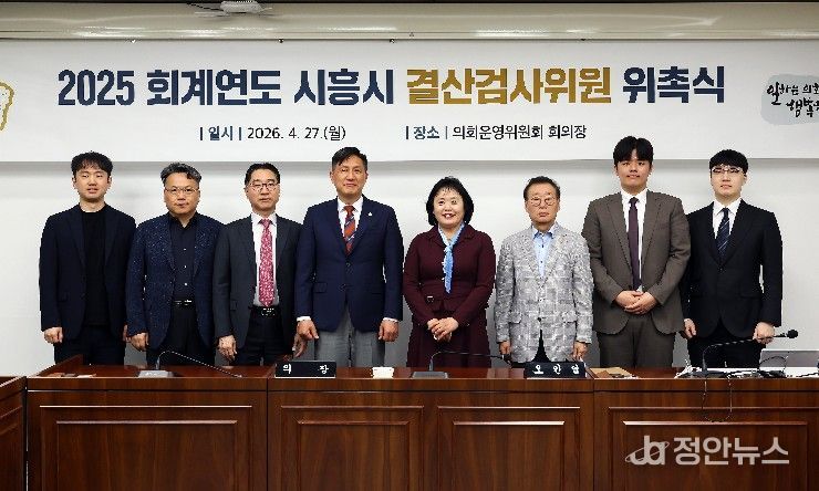 정안뉴스 안정주 기자 | 경기 시흥시의회가 4월 27일 의회운영위원회 회의장에서 2025회계연도 시흥시 결산검사위원 위촉식을 개최했다.