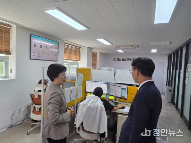 김명주 경남도 경제부지사는 24일 창원시 사림동에 위치한 경남도 민원콜센터를 방문해 운영상황을 점검했다. 경남도 민원콜센터에는 상담원 9명이 근무하고 있으며 일자리, 청년, 보건, 복지 등 797종의 상담 매뉴얼을 갖추고 1일 평균 217건의 민원콜을 처리하고 있다.