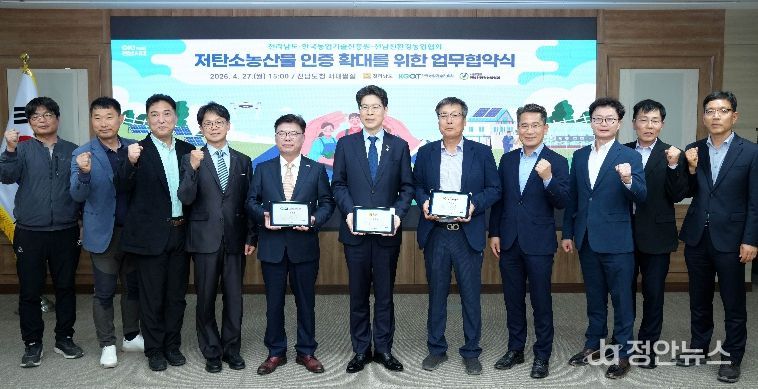 정안뉴스 안정주 기자 | 전라남도는 27일 도청에서 한국농업기술진흥원, 전남친환경농업협회와 함께 저탄소 농산물 인증 확대와 탄소 저감 실천을 위한 업무협약을 했다.