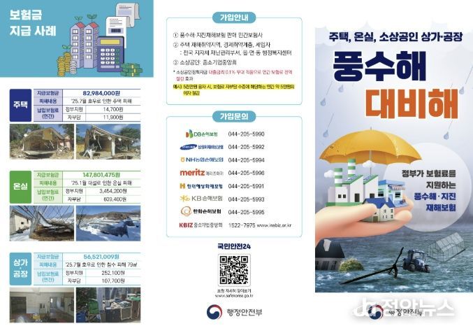 보험가입 대상은 △주택(단독·공동, 세입자 가입 가능) △농·임업용 온실(비닐하우스 포함) △소상공인(상가, 공장) 등이며, 가입은 7개 민간보험사(DB손해보험, 삼성화재보험, NH농협손해보험, 메리츠화재, 현대해상화재보험, KB손해보험, 한화손해보험)에서 가능하다.
