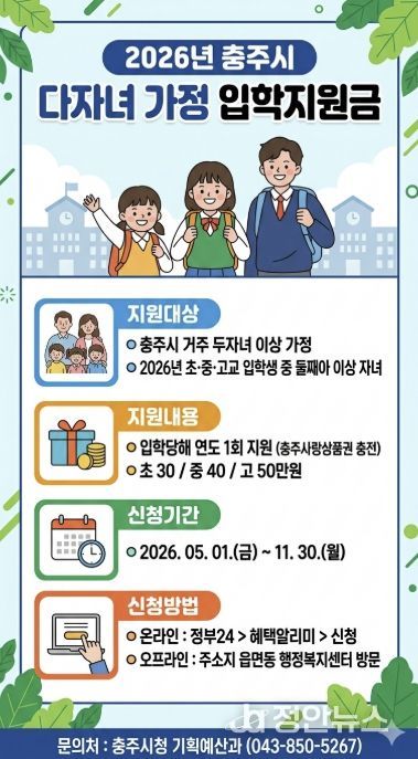 정안뉴스 안정주 기자 | 충주시는 다자녀 가정의 경제적 부담을 완화하고 안정적인 양육 환경을 조성하기 위해 2026학년도 초·중·고등학교에 입학하는 둘째 자녀 이상에게 입학지원금을 지원한다고 밝혔다.