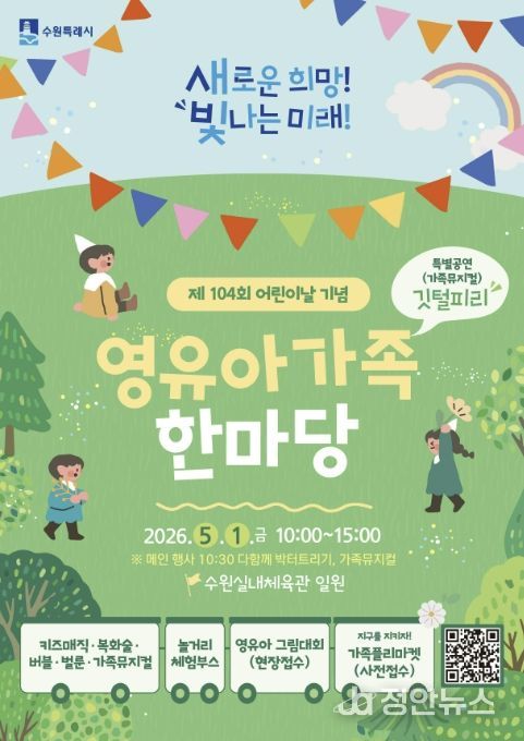 정안뉴스 안정주 기자 | 수원특례시는 5월 1일 10시부터 15시까지 수원체육관 일원에서 제104회 어린이날 기념 ‘영유아 가족 한마당’을 연다.