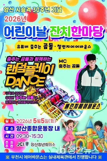 정안뉴스 김재홍 기자 | 양산시는 5월 5일 9시 30분부터 15시 30분까지 양산종합운동장 주경기장에서 '2026년 어린이날 잔치 한마당' 행사가 개최된다고 밝혔다.