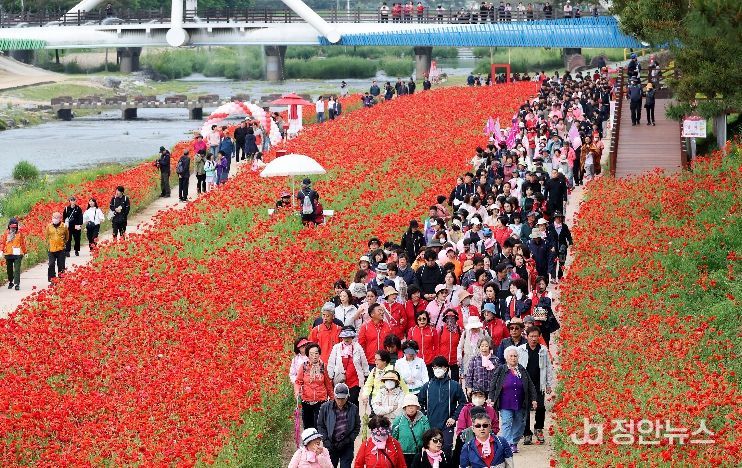 축제의 백미는 동진천변에 펼쳐진 거대한 붉은 봄꽃 군락이다. 왕복 3.3킬로미터(km) 구간을 따라 양귀비 10만 본, 작약 16만 본, 꽃잔디 8만 본을 가득 심고 끝없는 붉은 꽃물결을 빚어냈다.