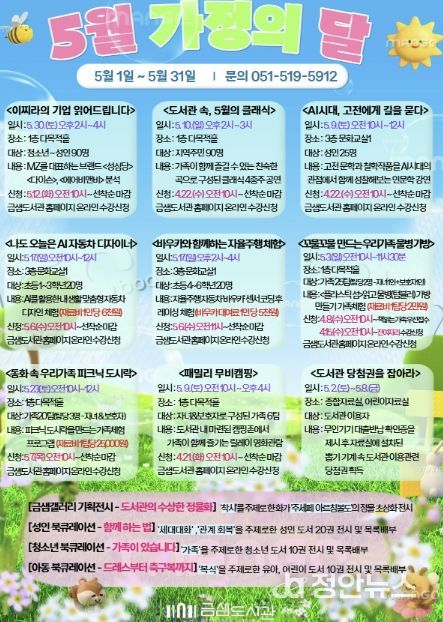 정안뉴스 안정주 기자 | 부산 금정구 금샘도서관은 5월 가정의 달을 맞아 오는 5월 1일부터 31일까지 작가(유튜버) 강연, 클래식 공연, 체험행사 등 온 가족이 함께 즐길 수 있는 '가정의 달' 특별 프로그램을 운영한다고 밝혔다.
