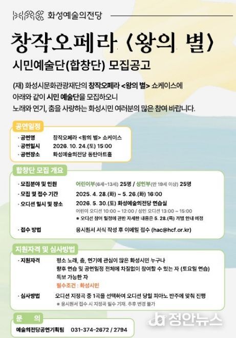 정안뉴스 안정주 기자 | (재)화성시문화관광재단은 오는 10월 개최 예정인 창작오페라 '왕의 별' 쇼케이스 무대에 참여할 시민합창단을 모집한다.