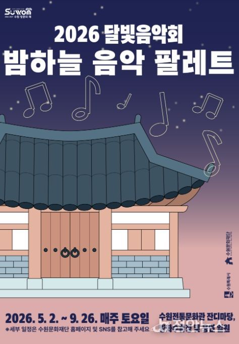 정안뉴스 안정주 기자 | 수원문화재단은 오는 5월부터 9월까지 국가유산과 자연, 음악이 어우러진 야간 공연 프로그램 '2026 달빛음악회 '밤하늘 음악 팔레트'’를 운영한다.