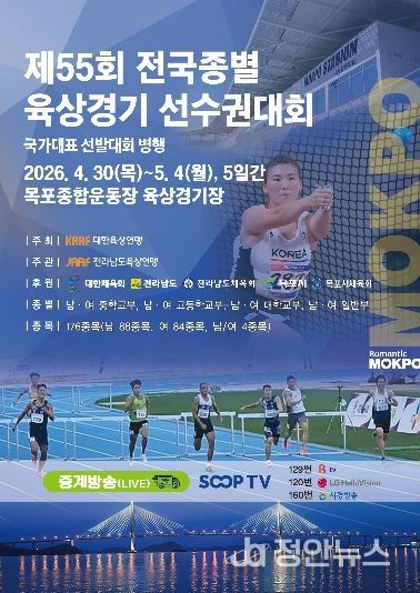 정안뉴스 안정주 기자 | 목포시는 오는 4월 30일부터 5월 4일까지 5일간 목포종합경기장에서 ‘제55회 전국종별육상경기선수권대회’와 ‘2026 아시아투척선수권대회’를 개최한다고 밝혔다.