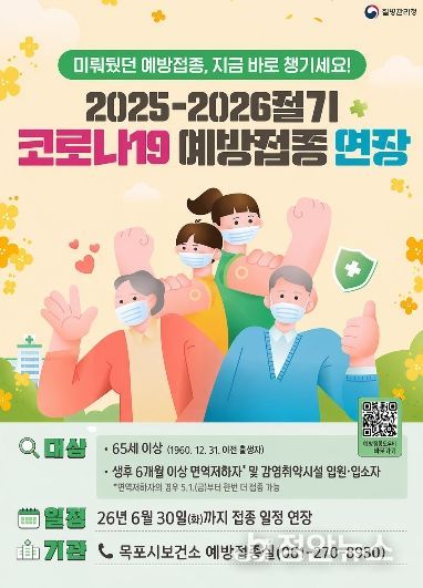 정안뉴스 안정주 기자 | 목포시는 2025~2026절기 코로나19 예방접종사업 기간을 오는 5월 1일부터 6월 30일까지 2개월간 연장 운영한다고 밝혔다.