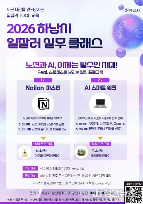 정안뉴스 안정주 기자 | 하남시는 관내 청년들이 현장에서 바로 활용할 수 있는 실무 역량을 키우고 또래 청년 간 교류 기회를 확대하기 위해 오는 5월부터 ‘2026년 하남시 일잘러 실무클래스’를 운영하고 1기와 2기 참여자를 모집한다고 밝혔다.