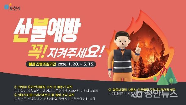 포천시는 시민들에게 영농부산물·쓰레기 불법 소각 금지, 산행 시 라이터·버너 등 화기 소지 및 흡연 금지, 입산통제구역과 등산로 폐쇄 구간 출입 금지 등 산불예방 수칙 준수를 당부했다.