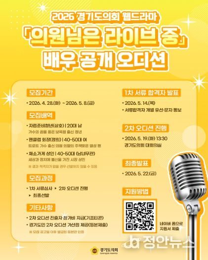 정안뉴스 안정주 기자 | 경기도의회는 2026년도 경기도의회 웹드라마 ‘의원님은 라이브 중(가제)’에 출연할 배우를 공개 모집하기 위해 오디션을 개최한다.