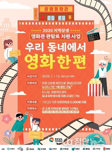 정안뉴스 김재홍 기자 | 거창군은 다가오는 5월 가정의 달을 맞이해 군민들의 문화 향유 기회를 확대하고 지역 영화관의 활성화를 돕기 위해 ‘2026년 지역상생 영화관 관람료 지원사업’을 시행한다.