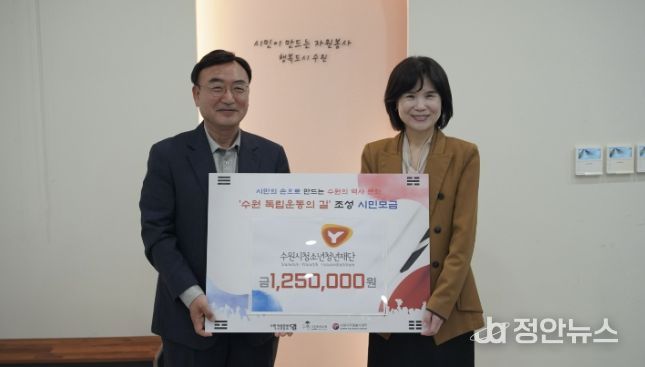 정안뉴스 안정주 기자 | 수원시청소년청년재단은 28일, 수원시자원봉사센터와 수원 독립운동의 길 추진위원회가 주관하는 ‘수원 독립운동의 길’ 조성 시민 모금에 재단 임직원이 자율적으로 모금한 125만원을 기부했다고 밝혔다.