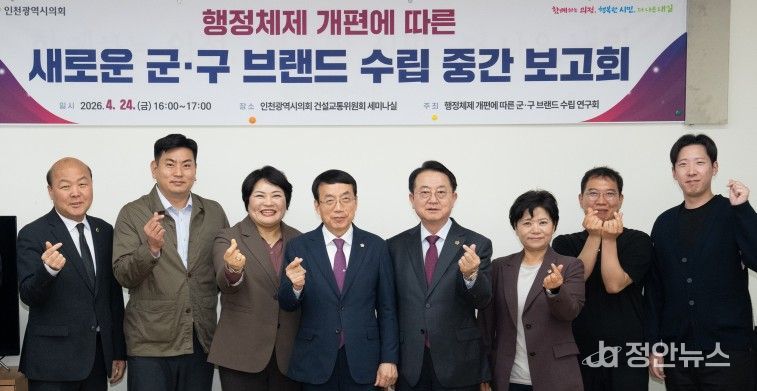 정안뉴스 안정주 기자 | 인천광역시의회 ‘행정체제 개편에 따른 군·구 브랜드 수립 연구회(대표의원 허식)’는 최근 시의회 건설교통위원회 세미나실에서 새로운 군ㆍ구 브랜드 수립을 위한 연구용역 중간보고회를 개최했다고 28일 밝혔다.