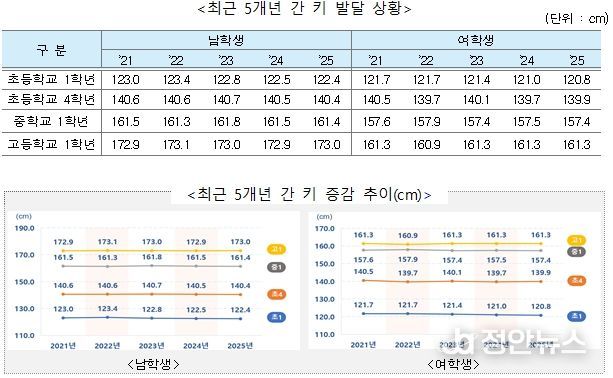 키 발달 상황을 보면, 남학생의 경우 초등학교 1학년은 122.4cm, 4학년은 140.4cm, 중학교 1학년은 161.4cm, 고등학교 1학년은 173.0cm이다. 여학생의 경우 초등학교 1학년은 120.8cm, 4학년은 139.9cm, 중학교 1학년은 157.4cm, 고등학교 1학년은 161.3cm로 남·여 학생 모두 이전 연도와 유사했다.