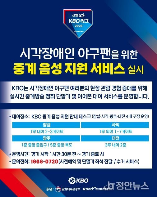 정안뉴스 안정주 기자 | KBO는 2023년부터 잠실, 사직, 광주 구장에서 운영해 온 ‘KBO 리그 시각장애인 현장 관람객 대상 중계 음성 지원 서비스’를 올해 대전 한화생명 볼파크까지 확대해 총 4개 구장에서 운영한다.