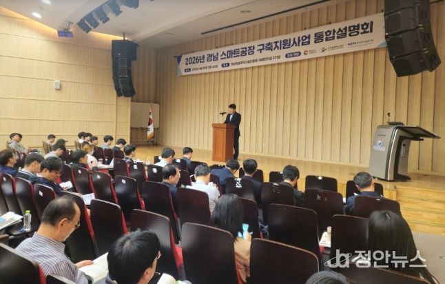 정안뉴스 김재홍 기자 | 경상남도는 28일 경남테크노파크 경남창원과학기술진흥원에서 ‘2026년 경남 스마트공장 구축 지원사업 통합 설명회’를 개최하고, 제조 인공지능(AI) 기반 스마트공장 보급·확산에 속도를 낸다고 밝혔다.