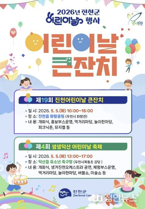 정안뉴스 안정주 기자 | 충북 진천군은 제104회 어린이날을 맞아 5월 5일 진천읍 화랑공원과 덕산읍 유소년축구장 두 곳에서 어린이날 기념행사를 개최한다고 밝혔다.
