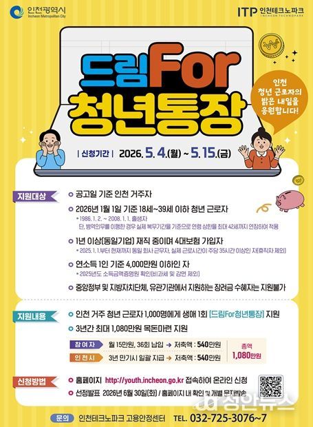 정안뉴스 안정주 기자 | 인천광역시는 청년들이 안정적으로 미래를 설계하고 목돈을 마련할 수 있도록 지원하는 ‘드림For청년통장’ 사업 참여자를 오는 5월 4일부터 15일까지 모집한다고 밝혔다.