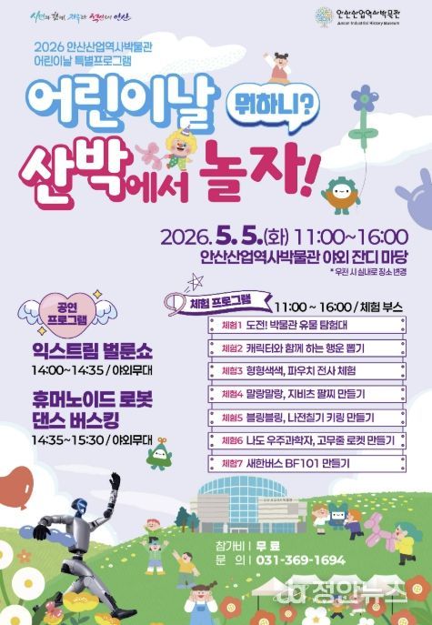 정안뉴스 안정주 기자 | 안산시는 내달 5일 어린이날을 맞아 안산산업역사박물관에서 어린이날 특별프로그램 ‘어린이날 뭐하니? 산박에서 놀자!’를 개최한다고 29일 밝혔다.