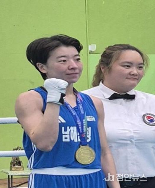 정안뉴스 김재홍 기자 | 남해군은 지난 4월 14일부터 24일까지 경상북도 영주시에서 열린 ‘2026 전국종별복싱선수권대회’에 출전한 남해군청 복싱팀의 강지숙 선수가 여자부 –65kg급에서 금메달을 획득했다고 밝혔다.