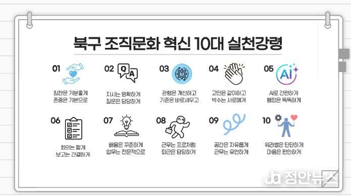 한편, 오는 30일 오후 3시 북구청 3층 회의실에서는 ‘조직문화 혁신을 위한 10대 실천 강령 선언식’이 개최된다.